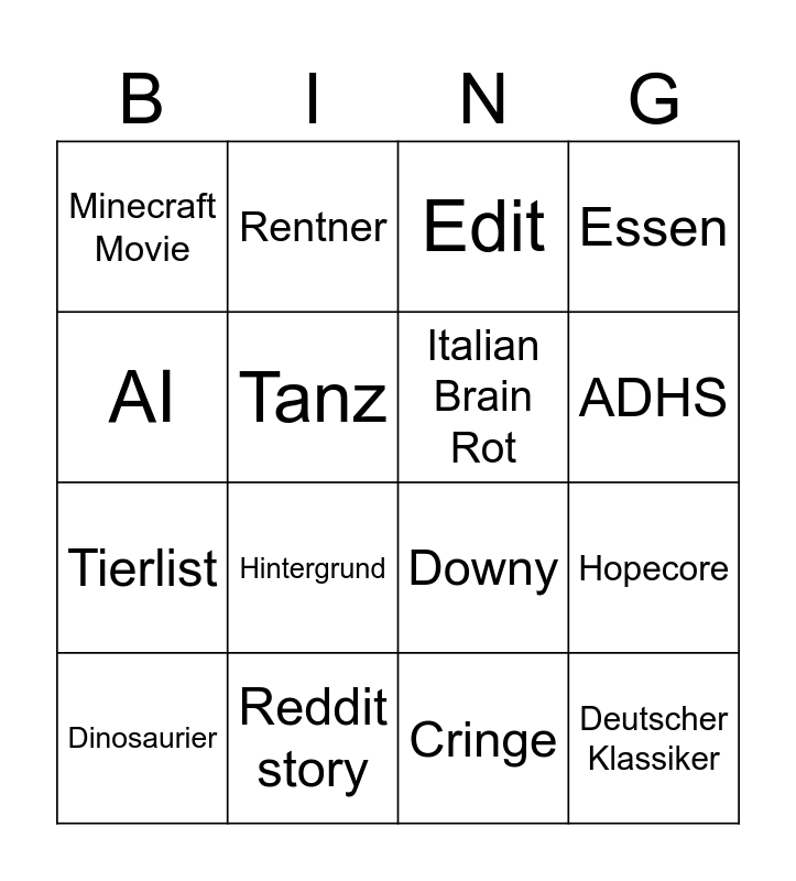 This bingo card has 16 words: Reddit story, Hopecore, Edit, Minecraft Movie, Tierlist, Rentner, Downy, Cringe, AI, Tanz, Dinosaurier, Essen, Hintergrund, ADHS, Italian Brain Rot and Deutscher Klassiker.