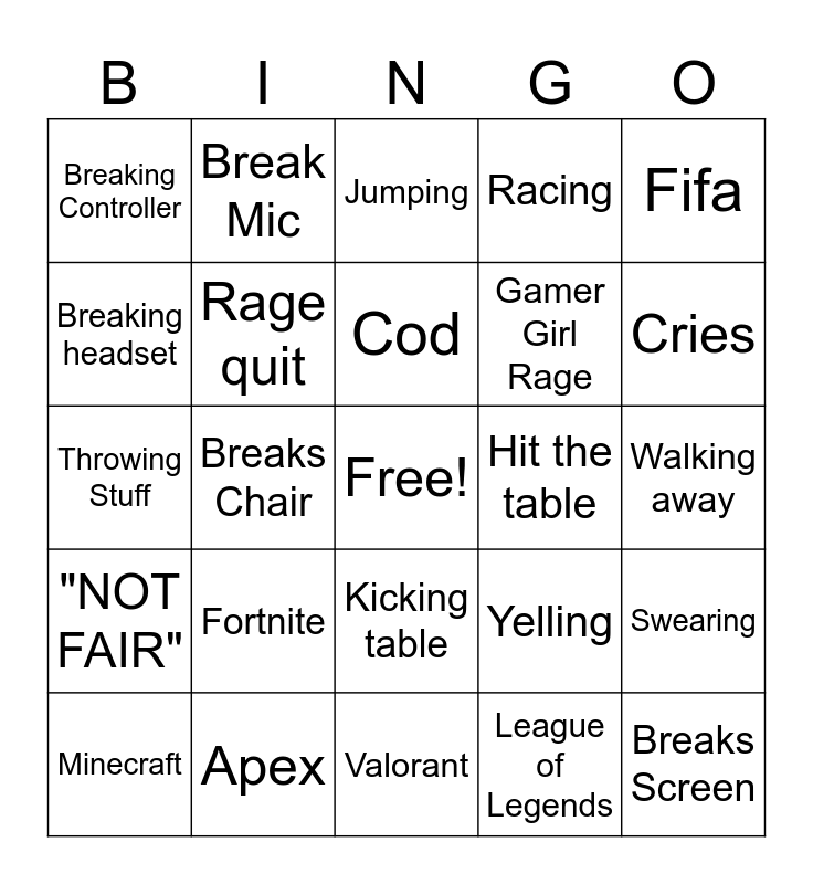 This bingo card has a free space and 24 words: Fortnite, Apex, Cod, Minecraft, Fifa, Breaking Controller, Breaking headset, Break Mic, Hit the table, Kicking table, Gamer Girl Rage, Throwing Stuff, Yelling, Swearing, Rage quit, League of Legends, Walking away, Jumping, Cries, Breaks Chair, Breaks Screen, "NOT FAIR", Racing and Valorant.