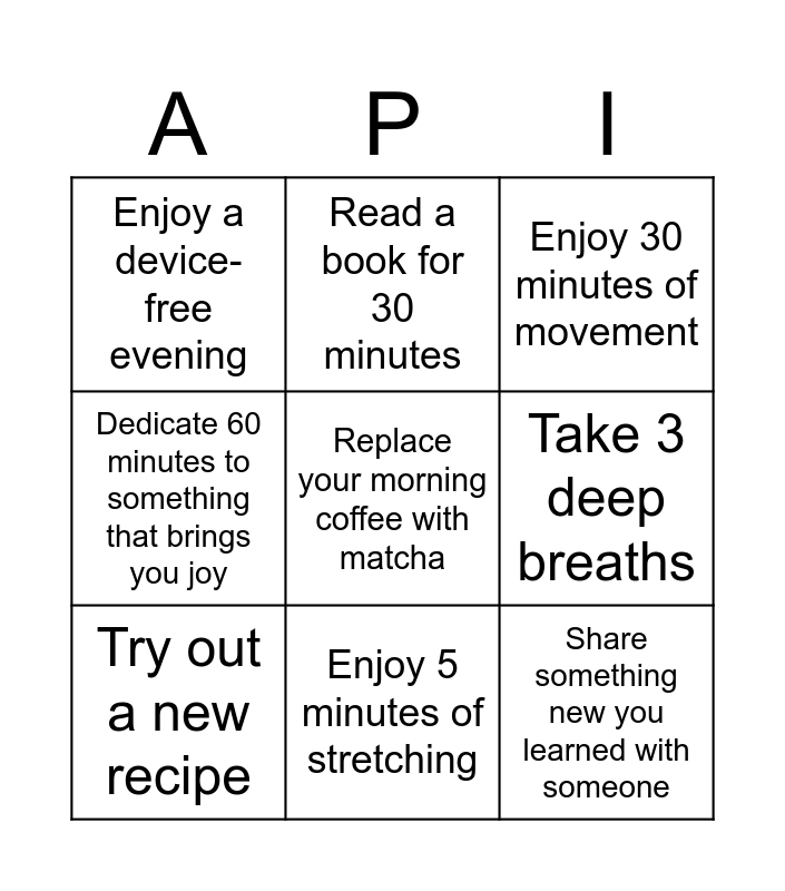 This bingo card has 9 words: Try out a new recipe, Replace your morning coffee with matcha, Enjoy 30 minutes of movement, Enjoy a device-free evening, Read a book for 30 minutes, Take 3 deep breaths, Dedicate 60 minutes to something that brings you joy, Enjoy 5 minutes of stretching and Share something new you learned with someone.