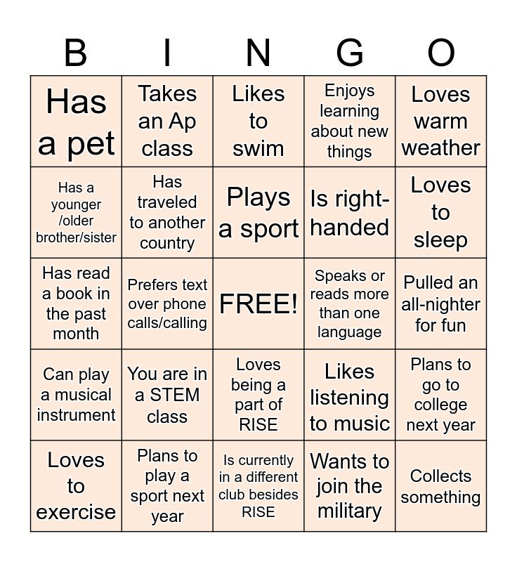 This bingo card has a free space and 24 words: You are in a STEM class, Plans to play a sport next year, Plays a sport, Loves to exercise, Loves warm weather, Has a pet, Has a younger /older brother/sister, Takes an Ap class, Speaks or reads more than one language, Loves being a part of RISE, Is right-handed, Has read a book in the past month, Likes listening to music, Plans to go to college next year, Has traveled to another country, Wants to join the military, Pulled an all-nighter for fun, Likes to swim, Loves to sleep, Prefers text over phone calls/calling, Collects something, Can play a musical instrument, Enjoys learning about new things and Is currently in a different club besides RISE.