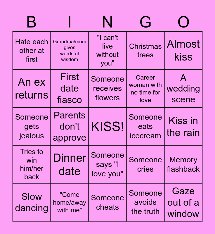 This bingo card has a free space and 39 words: Set in a small town, Something or someone gets lost, A scene in an airport, First date fiasco, Slow dancing, Someone says "I love you", Someone receives flowers, Someone drinks coffee, Almost kiss, Tries to win him/her back, Parents don't approve, Christmas trees, Gaze out of a window, Kiss in the rain, Someone eats icecream, Dinner date, There is a fight between characters, Hate each other at first, Montage, Someone cries, An ex returns, Someone cheats, Career woman with no time for love, A wedding scene, Trip and fall into someone's arms, A lie is discovered, Someone can't drive, An old truck, Best friend speech of encouragement, Grandma/mom gives words of wisdom, "You're perfect for each other", "Stop lying to yourself", "I can't live without you", "Come home/away with me", Someone avoids the truth, A character has a shady past, Memory flashback, Someone gets jealous and Someone is a single parent.
