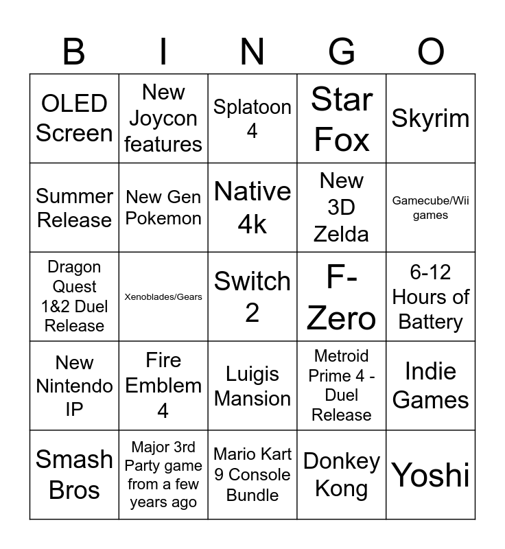This bingo card has a free space and 27 words: Metroid Prime 4 - Duel Release, New 3D Mario, New 3D Zelda, Mario Kart 9 Console Bundle, Summer Release, Splatoon 4, New Joycon features, New Nintendo IP, F-Zero, Indie Games, Dragon Quest 1&2 Duel Release, Star Fox, Smash Bros, Major 3rd Party game from a few years ago, Gamecube/Wii games, Internal Memory 256gb, New Gen Pokemon, Native 4k, Fire Emblem 4, OLED Screen, 6-12 Hours of Battery, Donkey Kong, Xenoblades/Gears, Yoshi, Luigis Mansion, Skyrim and Animal Crossing.
