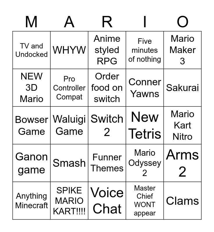 This bingo card has a free space and 24 words: Smash, SPIKE MARIO KART!!!!, Order food on switch, Anything Minecraft, Mario Maker 3, TV and Undocked, NEW 3D Mario, WHYW, New Tetris, Funner Themes, Conner Yawns, Bowser Game, Mario Odyssey 2, Arms 2, Pro Controller Compat, Master Chief WONT appear, Mario Kart Nitro, Anime styled RPG, Sakurai, Waluigi Game, Clams, Ganon game, Five minutes of nothing and Voice Chat.