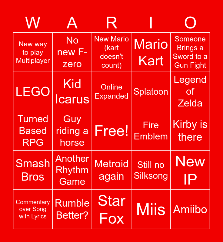 This bingo card has a free space and 24 words: Another Rhythm Game, Rumble Better?, Online Expanded, Commentary over Song with Lyrics, Someone Brings a Sword to a Gun Fight, New way to play Multiplayer, LEGO, No new F-zero, Fire Emblem, Metroid again, Splatoon, Turned Based RPG, Still no Silksong, New IP, Kid Icarus, Miis, Kirby is there, New Mario (kart doesn't count), Legend of Zelda, Guy riding a horse, Amiibo, Smash Bros, Mario Kart and Star Fox.