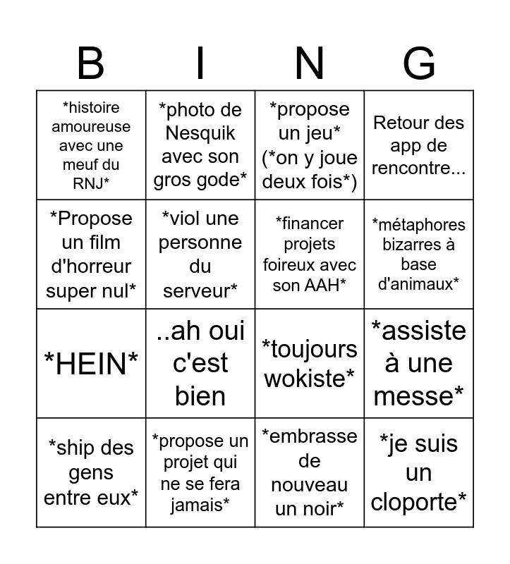 This bingo card has 16 words: *propose un projet qui ne se fera jamais*, *assiste à une messe*, *propose un jeu* (*on y joue deux fois*), *histoire amoureuse avec une meuf du RNJ*, *HEIN*, *photo de Nesquik avec son gros gode*, *toujours wokiste*, *embrasse de nouveau un noir*, *Propose un film d'horreur super nul*, *viol une personne du serveur*, *ship des gens entre eux*, Retour des app de rencontre..., ..ah oui c'est bien, *métaphores bizarres à base d'animaux*, *financer projets foireux avec son AAH* and *je suis un cloporte*.