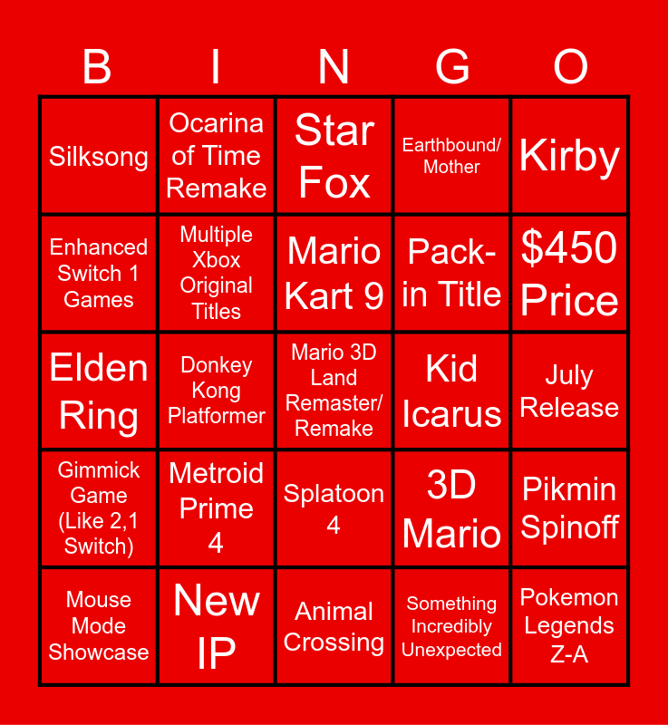 This bingo card has 25 words: Metroid Prime 4, Animal Crossing, Mario Kart 9, Mouse Mode Showcase, Kirby, Silksong, Enhanced Switch 1 Games, Ocarina of Time Remake, Kid Icarus, Splatoon 4, Pack-in Title, Elden Ring, 3D Mario, Pikmin Spinoff, Multiple Xbox Original Titles, Pokemon Legends Z-A, July Release, Star Fox, $450 Price, Donkey Kong Platformer, Mario 3D Land Remaster/ Remake, New IP, Gimmick Game (Like 2,1 Switch), Earthbound/ Mother and Something Incredibly Unexpected.