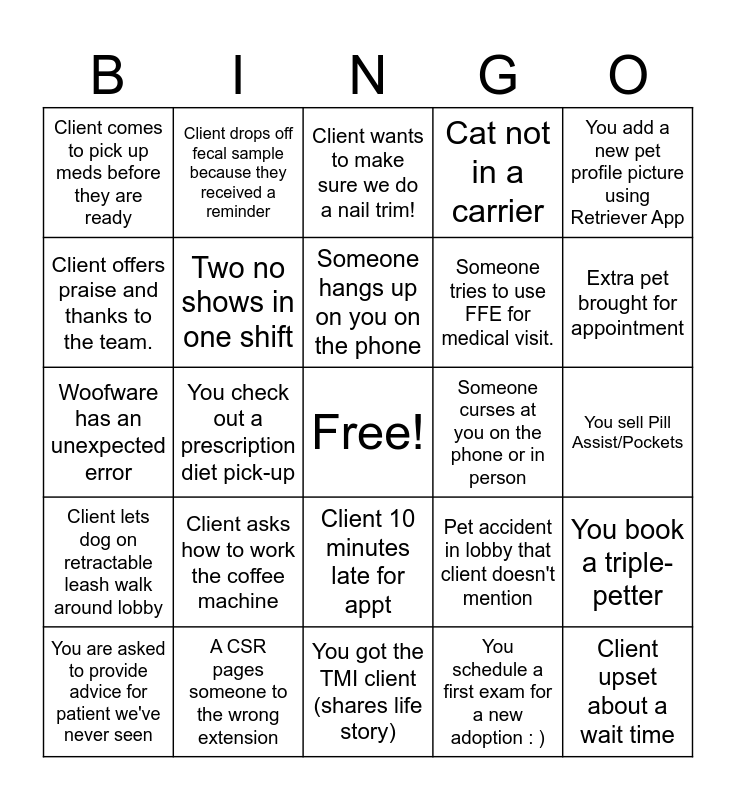 This bingo card has a free space and 39 words: You signed somone up for CareClub, You check out a non-wellness visit without having to verify charges, fix orange pencils, or find out any follow-up info, Client knocking on/trying to open door before or after opening, Two no shows in one shift, You are asked to provide advice for patient we've never seen, Client 10 minutes late for appt, Someone hangs up on you on the phone, Client complains about a price at the front desk, You add a new pet profile picture using Retriever App, Client lets dog on retractable leash walk around lobby, You check out a prescription diet pick-up, Cat not in a carrier, Client upset about a wait time, You sell Pill Assist/Pockets, Someone curses at you on the phone or in person, Client asks how to work the coffee machine, Someone needs a same day appointment but we're booked, Client comes to pick up meds before they are ready, You organize a referral to Blue Pearl, Pet accident in lobby that client doesn't mention, Client offers praise and thanks to the team., You got the TMI client (shares life story), Someone tries to use FFE for medical visit., Extra pet brought for appointment, Client mispronounces Simparica, You sign someone up for NeverForget, Client says they do not need prevention for indoor pets, Client used cash as payment, Client asks if we have payment plans, Client drops off fecal sample because they received a reminder, Patient begs for treats at the desk, Client leaves phone in lobby when they go into exam room, Client wants to make sure we do a nail trim!, A CSR pages someone to the wrong extension, You schedule a first exam for a new adoption : ), Client brings goodies, You book a triple- petter, Woofware has an unexpected error and Paper jam in the printer.