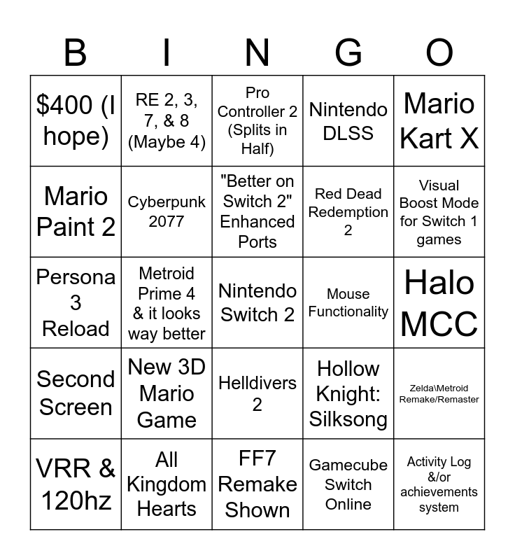 This bingo card has a free space and 24 words: New 3D Mario Game, All Kingdom Hearts, "Better on Switch 2" Enhanced Ports, VRR & 120hz, Mario Kart X, $400 (I hope), Mario Paint 2, RE 2, 3, 7, & 8 (Maybe 4), Mouse Functionality, Helldivers 2, Red Dead Redemption 2, Persona 3 Reload, Hollow Knight: Silksong, Zelda\Metroid Remake/Remaster, Cyberpunk 2077, Gamecube Switch Online, Halo MCC, Pro Controller 2 (Splits in Half), Visual Boost Mode for Switch 1 games, Metroid Prime 4 & it looks way better, Activity Log &/or achievements system, Second Screen, Nintendo DLSS and FF7 Remake Shown.
