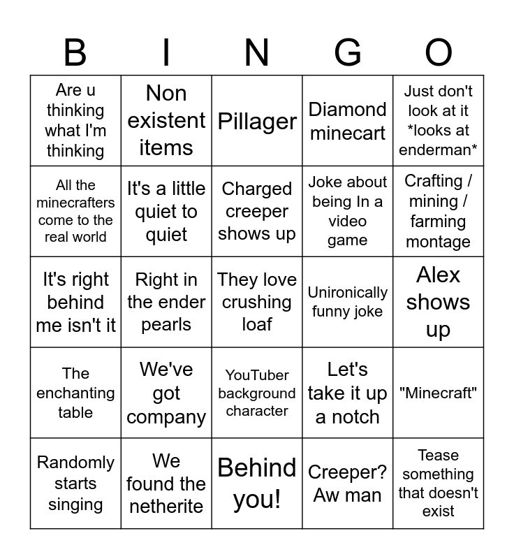 This bingo card has a free space and 24 words: Randomly starts singing, We've got company, Charged creeper shows up, Creeper? Aw man, Just don't look at it *looks at enderman*, Are u thinking what I'm thinking, Non existent items, Pillager, Unironically funny joke, Alex shows up, It's right behind me isn't it, It's a little quiet to quiet, Let's take it up a notch, "Minecraft", All the minecrafters come to the real world, We found the netherite, Behind you!, Diamond minecart, Crafting / mining / farming montage, The enchanting table, Right in the ender pearls, YouTuber background character, Joke about being In a video game and Tease something that doesn't exist.