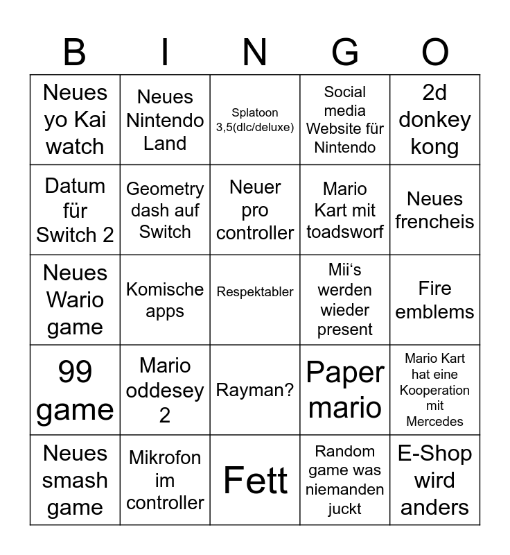This bingo card has a free space and 24 words: Mario oddesey 2, Mikrofon im controller, Neuer pro controller, Neues smash game, 2d donkey kong, Neues yo Kai watch, Datum für Switch 2, Neues Nintendo Land, Mii‘s werden wieder present, Rayman?, Mario Kart mit toadsworf, Neues Wario game, Paper mario, Mario Kart hat eine Kooperation mit Mercedes, Geometry dash auf Switch, Random game was niemanden juckt, Fire emblems, Splatoon 3,5(dlc/deluxe), Neues frencheis, Komische apps, E-Shop wird anders, 99 game, Social media Website für Nintendo and Fett.