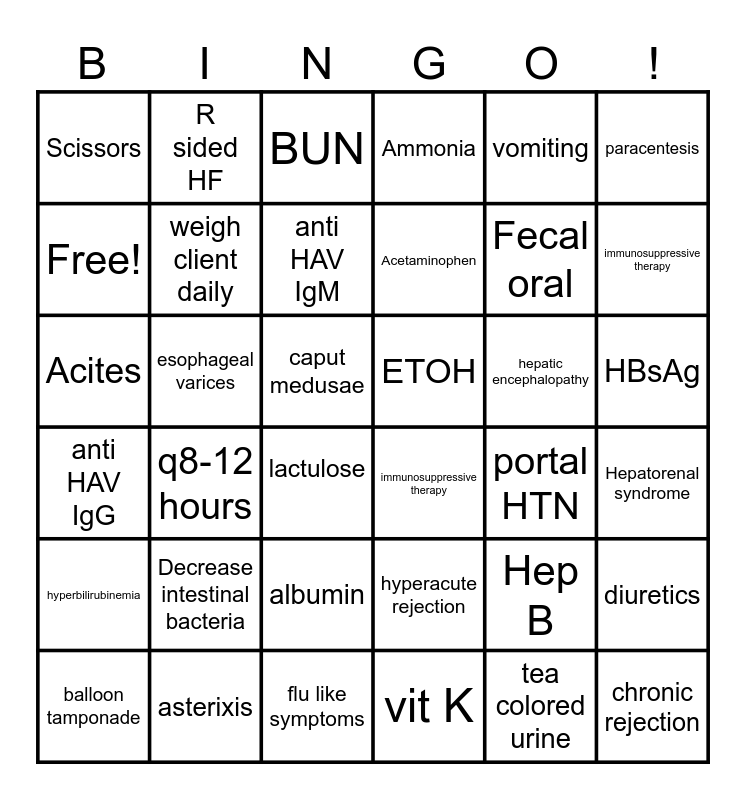 This bingo card has 36 words: anti HAV IgG, q8-12 hours, flu like symptoms, Acetaminophen, hepatic encephalopathy, HBsAg, Scissors, asterixis, BUN, hyperacute rejection, Fecal oral, paracentesis, hyperbilirubinemia, esophageal varices, anti HAV IgM, Ammonia, Hep B, Hepatorenal syndrome, Free!, weigh client daily, lactulose, immunosuppressive therapy, portal HTN, diuretics, Acites, R sided HF, caput medusae, vit K, vomiting, immunosuppressive therapy, balloon tamponade, Decrease intestinal bacteria, albumin, ETOH, tea colored urine and chronic rejection.