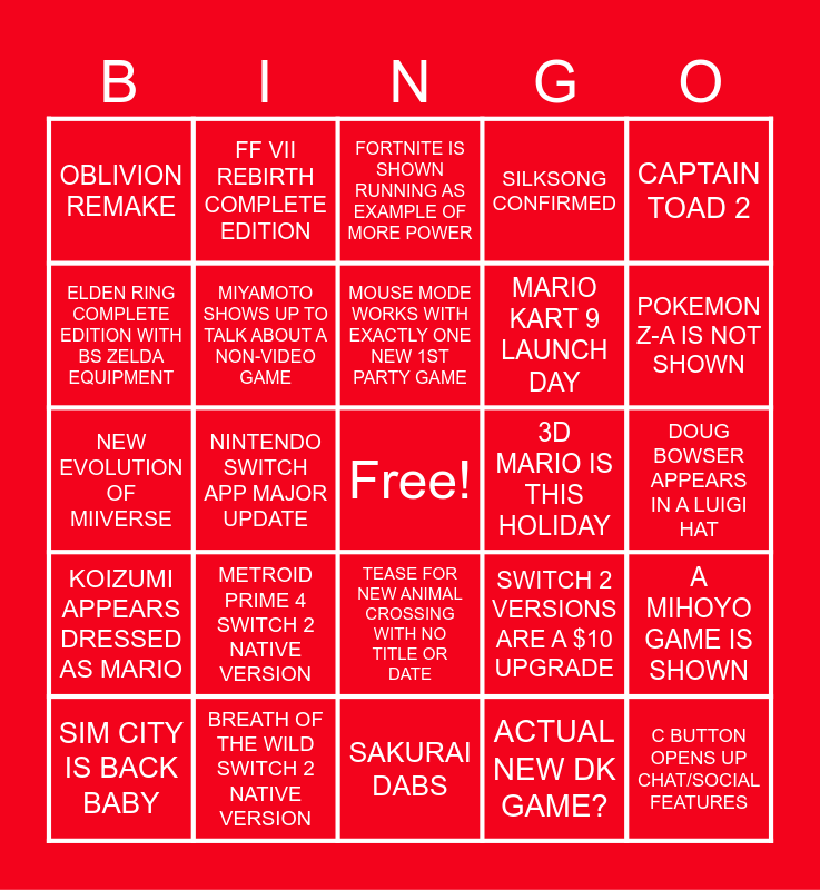 This bingo card has a free space and 24 words: METROID PRIME 4 SWITCH 2 NATIVE VERSION, BREATH OF THE WILD SWITCH 2 NATIVE VERSION, MOUSE MODE WORKS WITH EXACTLY ONE NEW 1ST PARTY GAME, SIM CITY IS BACK BABY, CAPTAIN TOAD 2, OBLIVION REMAKE, ELDEN RING COMPLETE EDITION WITH BS ZELDA EQUIPMENT, FF VII REBIRTH COMPLETE EDITION, 3D MARIO IS THIS HOLIDAY, TEASE FOR NEW ANIMAL CROSSING WITH NO TITLE OR DATE, MARIO KART 9 LAUNCH DAY, NEW EVOLUTION OF MIIVERSE, SWITCH 2 VERSIONS ARE A $10 UPGRADE, A MIHOYO GAME IS SHOWN, MIYAMOTO SHOWS UP TO TALK ABOUT A NON-VIDEO GAME, ACTUAL NEW DK GAME?, DOUG BOWSER APPEARS IN A LUIGI HAT, FORTNITE IS SHOWN RUNNING AS EXAMPLE OF MORE POWER, POKEMON Z-A IS NOT SHOWN, NINTENDO SWITCH APP MAJOR UPDATE, C BUTTON OPENS UP CHAT/SOCIAL FEATURES, KOIZUMI APPEARS DRESSED AS MARIO, SILKSONG CONFIRMED and SAKURAI DABS.