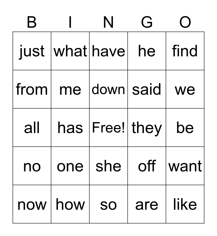 This bingo card has a free space and 24 words: one, how, down, now, find, just, from, what, they, she, said, all, off, want, me, are, be, have, we, has, like, no, he and so.