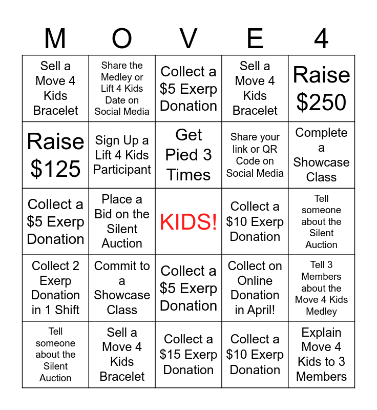 This bingo card has a free space and 24 words: Commit to a Showcase Class, Sell a Move 4 Kids Bracelet, Get Pied 3 Times, Tell someone about the Silent Auction, Raise $250, Sell a Move 4 Kids Bracelet, Raise $125, Share the Medley or Lift 4 Kids Date on Social Media, Collect a $10 Exerp Donation, Collect a $5 Exerp Donation, Share your link or QR Code on Social Media, Collect a $5 Exerp Donation, Collect on Online Donation in April!, Tell 3 Members about the Move 4 Kids Medley, Sign Up a Lift 4 Kids Participant, Collect a $10 Exerp Donation, Tell someone about the Silent Auction, Collect a $5 Exerp Donation, Complete a Showcase Class, Place a Bid on the Silent Auction, Explain Move 4 Kids to 3 Members, Collect 2 Exerp Donation in 1 Shift, Sell a Move 4 Kids Bracelet and Collect a $15 Exerp Donation.