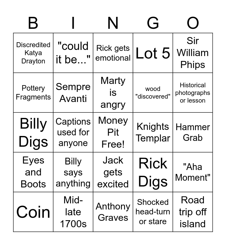 This bingo card has a free space and 24 words: Billy says anything, Mid-late 1700s, Marty is angry, Coin, Sir William Phips, Discredited Katya Drayton, Pottery Fragments, "could it be...", Knights Templar, Jack gets excited, wood "discovered", Billy Digs, Rick Digs, "Aha Moment", Sempre Avanti, Shocked head-turn or stare, Hammer Grab, Rick gets emotional, Historical photographs or lesson, Captions used for anyone, Road trip off island, Eyes and Boots, Lot 5 and Anthony Graves.