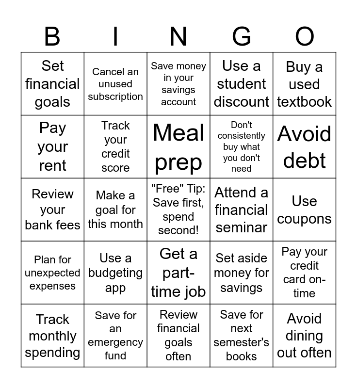 This bingo card has a free space and 24 words: Use a budgeting app, Save for an emergency fund, Meal prep, Track monthly spending, Buy a used textbook, Set financial goals, Pay your rent, Cancel an unused subscription, Attend a financial seminar, Get a part-time job, Don't consistently buy what you don't need, Review your bank fees, Set aside money for savings, Pay your credit card on-time, Track your credit score, Save for next semester's books, Use coupons, Save money in your savings account, Avoid debt, Make a goal for this month, Avoid dining out often, Plan for unexpected expenses, Use a student discount and Review financial goals often.