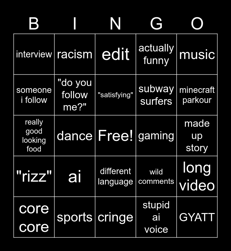This bingo card has a free space and 24 words: ai, sports, "satisfying", core core, music, interview, someone i follow, racism, gaming, different language, subway surfers, really good looking food, wild comments, long video, "do you follow me?", stupid ai voice, made up story, edit, minecraft parkour, dance, GYATT, "rizz", actually funny and cringe.