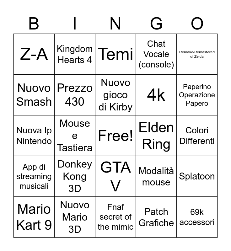 This bingo card has a free space and 24 words: Donkey Kong 3D, Nuovo Mario 3D, Nuovo gioco di Kirby, Mario Kart 9, Remake/Remastered di Zelda, Z-A, Nuovo Smash, Kingdom Hearts 4, Elden Ring, GTA V, 4k, Nuova Ip Nintendo, Modalità mouse, Splatoon, Prezzo 430, Patch Grafiche, Colori Differenti, Temi, Paperino Operazione Papero, Mouse e Tastiera, 69k accessori, App di streaming musicali, Chat Vocale (console) and Fnaf secret of the mimic.