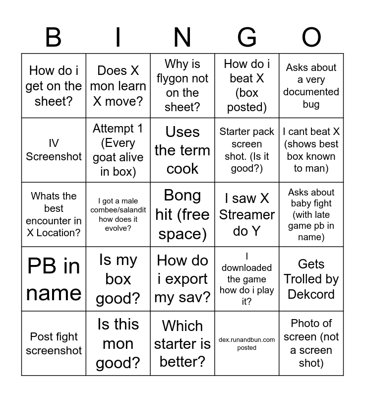 This bingo card has a free space and 24 words: Is my box good?, Is this mon good?, Uses the term cook, Post fight screenshot, Asks about a very documented bug, How do i get on the sheet?, IV Screenshot, Does X mon learn X move?, I saw X Streamer do Y, How do i export my sav?, Starter pack screen shot. (Is it good?), Whats the best encounter in X Location?, I downloaded the game how do i play it?, Gets Trolled by Dekcord, Attempt 1 (Every goat alive in box), dex.runandbun.com posted, Asks about baby fight (with late game pb in name), Why is flygon not on the sheet?, I cant beat X (shows best box known to man), I got a male combee/salandit how does it evolve?, Photo of screen (not a screen shot), PB in name, How do i beat X (box posted) and Which starter is better?.