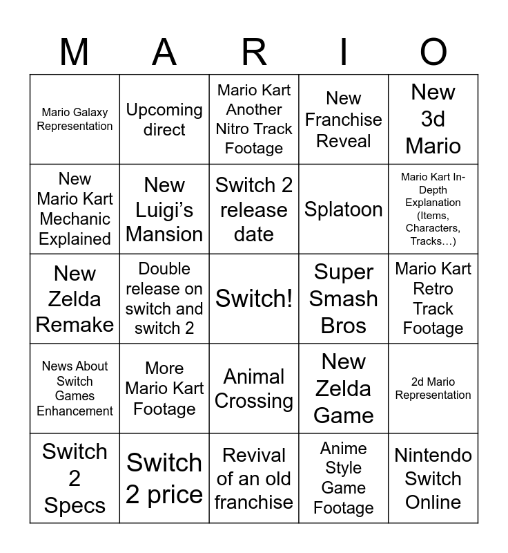 This bingo card has a free space and 24 words: More Mario Kart Footage, Switch 2 price, Switch 2 release date, Switch 2 Specs, New 3d Mario, Mario Galaxy Representation, New Mario Kart Mechanic Explained, Upcoming direct, Super Smash Bros, Animal Crossing, Splatoon, New Zelda Remake, New Zelda Game, 2d Mario Representation, New Luigi’s Mansion, Anime Style Game Footage, Mario Kart Retro Track Footage, Mario Kart Another Nitro Track Footage, Mario Kart In-Depth Explanation (Items, Characters, Tracks…), Double release on switch and switch 2, Nintendo Switch Online, News About Switch Games Enhancement, New Franchise Reveal and Revival of an old franchise.