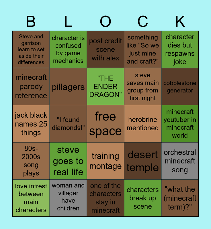This bingo card has a free space and 24 words: love intrest between main characters, steve goes to real life, "THE ENDER DRAGON", characters break up scene, character dies but respawns joke, Steve and garrison learn to set aside their differences, character is confused by game mechanics, post credit scene with alex, herobrine mentioned, minecraft youtuber in minecraft world, jack black names 25 things, pillagers, desert temple, orchestral minecraft song, minecraft parody reference, woman and villager have children, one of the characters stay in minecraft, something like "So we just mine and craft?", cobblestone generator, 80s- 2000s song plays, "I found diamonds!", training montage, steve saves main group from first night and "what the (minecraft term)?".