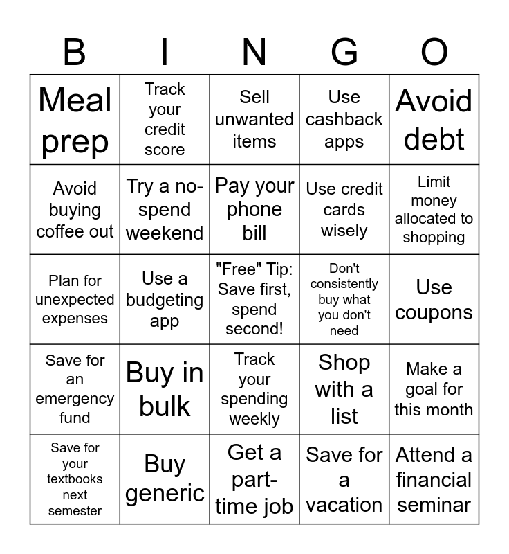 This bingo card has a free space and 24 words: Buy in bulk, Buy generic, Pay your phone bill, Save for your textbooks next semester, Avoid debt, Meal prep, Avoid buying coffee out, Track your credit score, Don't consistently buy what you don't need, Track your spending weekly, Use credit cards wisely, Plan for unexpected expenses, Shop with a list, Make a goal for this month, Try a no-spend weekend, Save for a vacation, Use coupons, Sell unwanted items, Limit money allocated to shopping, Use a budgeting app, Attend a financial seminar, Save for an emergency fund, Use cashback apps and Get a part-time job.
