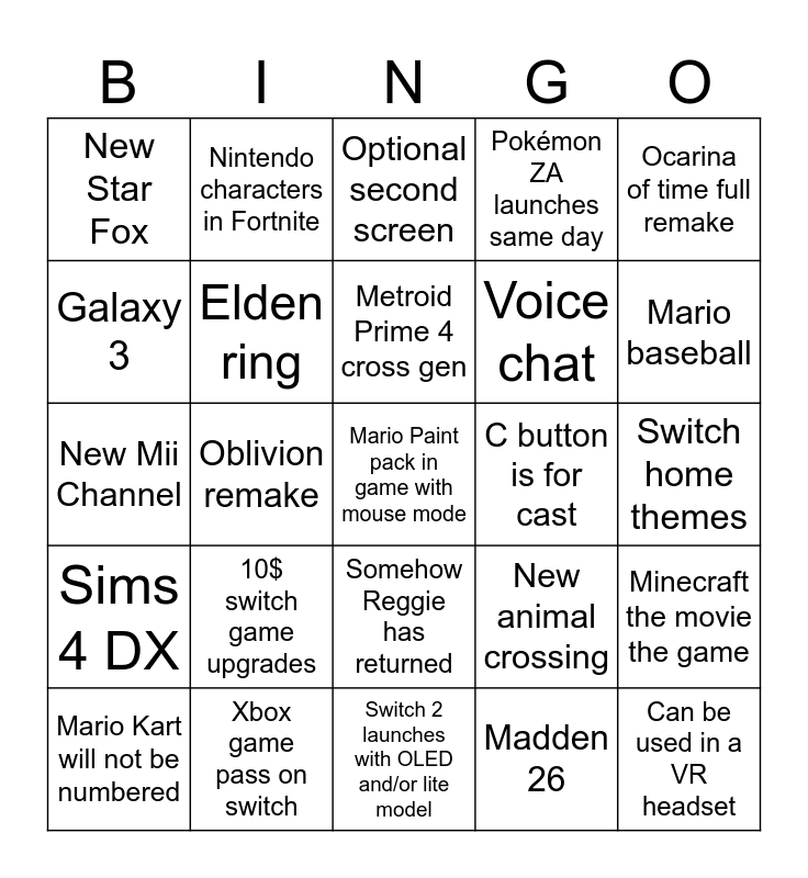 This bingo card has a free space and 24 words: 10$ switch game upgrades, Xbox game pass on switch, Metroid Prime 4 cross gen, Mario Kart will not be numbered, Ocarina of time full remake, New Star Fox, Galaxy 3, Nintendo characters in Fortnite, C button is for cast, Somehow Reggie has returned, Voice chat, New Mii Channel, New animal crossing, Minecraft the movie the game, Elden ring, Madden 26, Switch home themes, Optional second screen, Mario baseball, Oblivion remake, Can be used in a VR headset, Sims 4 DX, Pokémon ZA launches same day and Switch 2 launches with OLED and/or lite model.