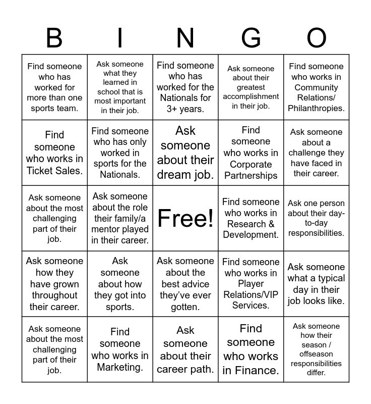 This bingo card has a free space and 24 words: Ask someone about how they got into sports., Find someone who works in Marketing., Ask someone about their dream job., Ask someone about the most challenging part of their job., Find someone who works in Community Relations/ Philanthropies., Find someone who has worked for more than one sports team., Find someone who works in Ticket Sales., Ask someone what they learned in school that is most important in their job., Find someone who works in Research & Development., Ask someone about the best advice they’ve ever gotten., Find someone who works in Corporate Partnerships, Ask someone about the most challenging part of their job., Find someone who works in Player Relations/VIP Services., Ask someone what a typical day in their job looks like., Find someone who has only worked in sports for the Nationals., Find someone who works in Finance., Ask one person about their day-to-day responsibilities., Find someone who has worked for the Nationals for 3+ years., Ask someone about a challenge they have faced in their career., Ask someone about the role their family/a mentor played in their career., Ask someone how their season / offseason responsibilities differ., Ask someone how they have grown throughout their career., Ask someone about their greatest accomplishment in their job. and Ask someone about their career path..