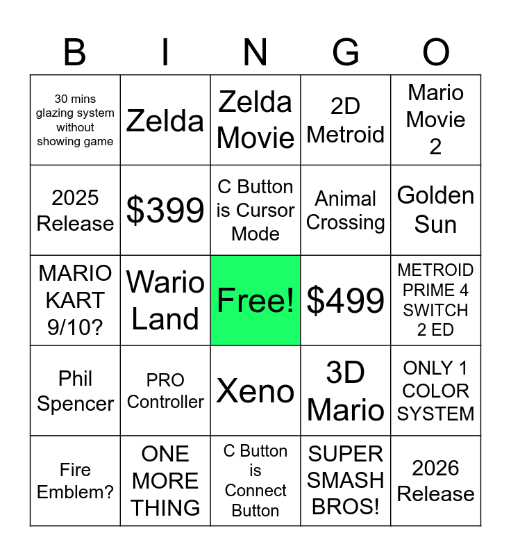 This bingo card has a free space and 24 words: PRO Controller, ONE MORE THING, C Button is Cursor Mode, Fire Emblem?, Mario Movie 2, 30 mins glazing system without showing game, 2025 Release, Zelda, $499, Xeno, Animal Crossing, MARIO KART 9/10?, 3D Mario, ONLY 1 COLOR SYSTEM, $399, SUPER SMASH BROS!, METROID PRIME 4 SWITCH 2 ED, Zelda Movie, Golden Sun, Wario Land, 2026 Release, Phil Spencer, 2D Metroid and C Button is Connect Button.