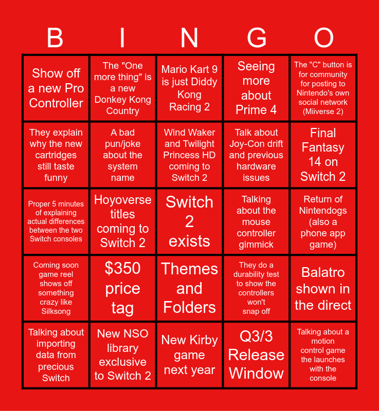 This bingo card has a free space and 24 words: $350 price tag, New NSO library exclusive to Switch 2, Wind Waker and Twilight Princess HD coming to Switch 2, Talking about importing data from precious Switch, The "C" button is for community for posting to Nintendo's own social network (Miiverse 2), Show off a new Pro Controller, They explain why the new cartridges still taste funny, The "One more thing" is a new Donkey Kong Country, Talking about the mouse controller gimmick, Themes and Folders, Talk about Joy-Con drift and previous hardware issues, Proper 5 minutes of explaining actual differences between the two Switch consoles, They do a durability test to show the controllers won't snap off, Balatro shown in the direct, A bad pun/joke about the system name, Q3/3 Release Window, Return of Nintendogs (also a phone app game), Mario Kart 9 is just Diddy Kong Racing 2, Final Fantasy 14 on Switch 2, Hoyoverse titles coming to Switch 2, Talking about a motion control game the launches with the console, Coming soon game reel shows off something crazy like Silksong, Seeing more about Prime 4 and New Kirby game next year.