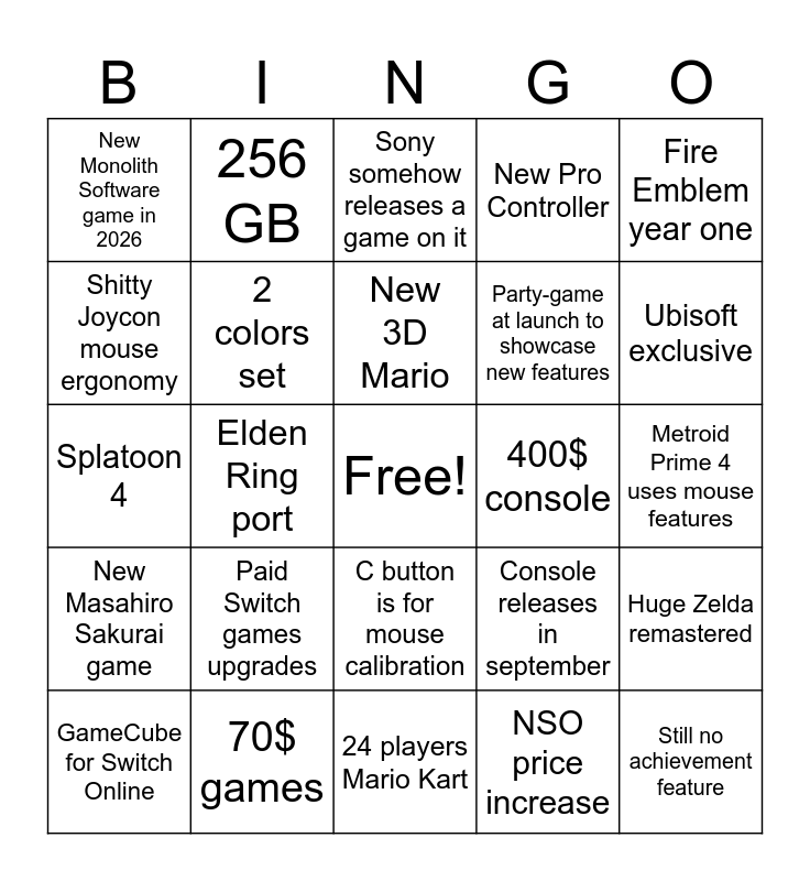 This bingo card has a free space and 24 words: Paid Switch games upgrades, 70$ games, New 3D Mario, GameCube for Switch Online, Fire Emblem year one, New Monolith Software game in 2026, Shitty Joycon mouse ergonomy, 256 GB, 400$ console, C button is for mouse calibration, Party-game at launch to showcase new features, Splatoon 4, Console releases in september, Huge Zelda remastered, 2 colors set, NSO price increase, Metroid Prime 4 uses mouse features, Sony somehow releases a game on it, Ubisoft exclusive, Elden Ring port, Still no achievement feature, New Masahiro Sakurai game, New Pro Controller and 24 players Mario Kart.