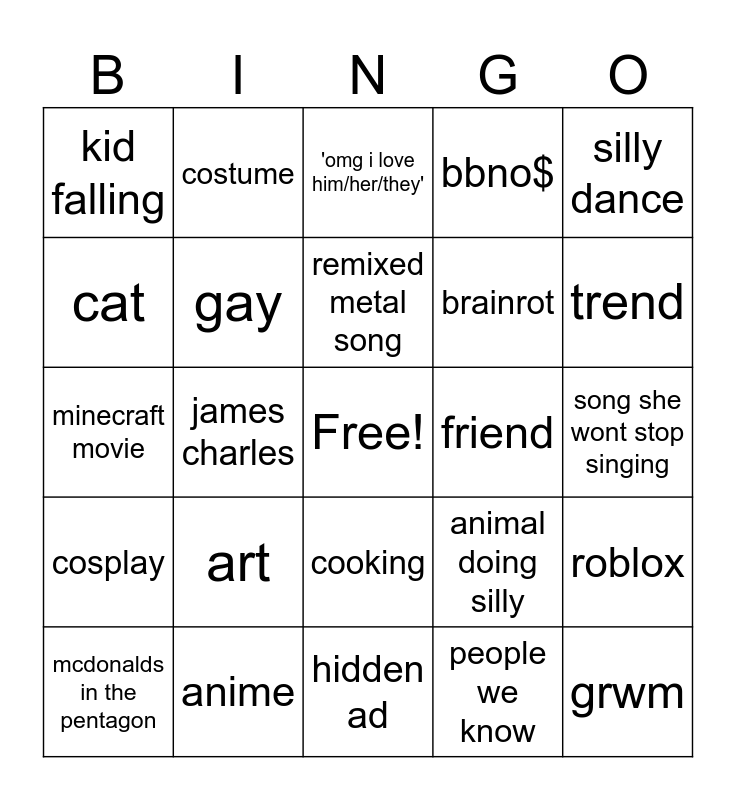 This bingo card has a free space and 24 words: art, anime, remixed metal song, mcdonalds in the pentagon, silly dance, kid falling, cat, costume, friend, cooking, brainrot, minecraft movie, animal doing silly, roblox, gay, people we know, song she wont stop singing, 'omg i love him/her/they', trend, james charles, grwm, cosplay, bbno$ and hidden ad.