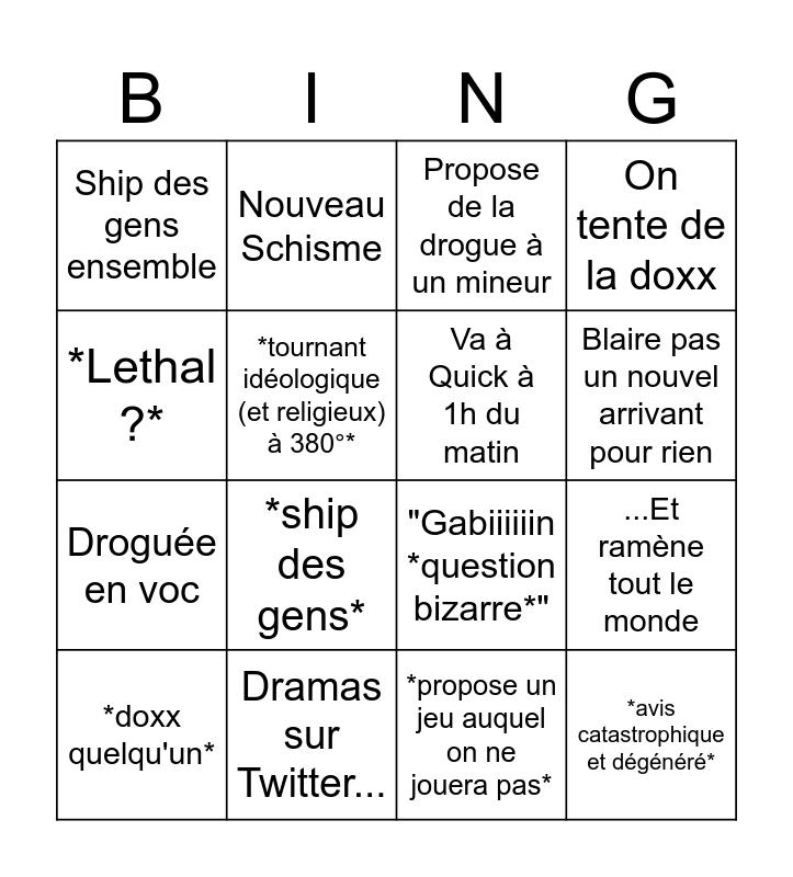 This bingo card has 16 words: Dramas sur Twitter..., ...Et ramène tout le monde, Propose de la drogue à un mineur, Ship des gens ensemble, Droguée en voc, Nouveau Schisme, "Gabiiiiiin *question bizarre*", *propose un jeu auquel on ne jouera pas*, *Lethal ?*, *tournant idéologique (et religieux) à 380°*, *doxx quelqu'un*, On tente de la doxx, *ship des gens*, Blaire pas un nouvel arrivant pour rien, Va à Quick à 1h du matin and *avis catastrophique et dégénéré*.
