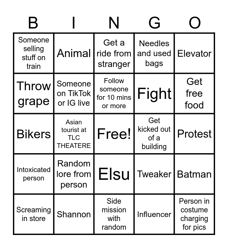 This bingo card has a free space and 24 words: Random lore from person, Shannon, Follow someone for 10 mins or more, Screaming in store, Elevator, Someone selling stuff on train, Throw grape, Animal, Get kicked out of a building, Elsu, Fight, Bikers, Tweaker, Batman, Someone on TikTok or IG live, Influencer, Protest, Get a ride from stranger, Get free food, Asian tourist at TLC THEATERE, Person in costume charging for pics, Intoxicated person, Needles and used bags and Side mission with random.