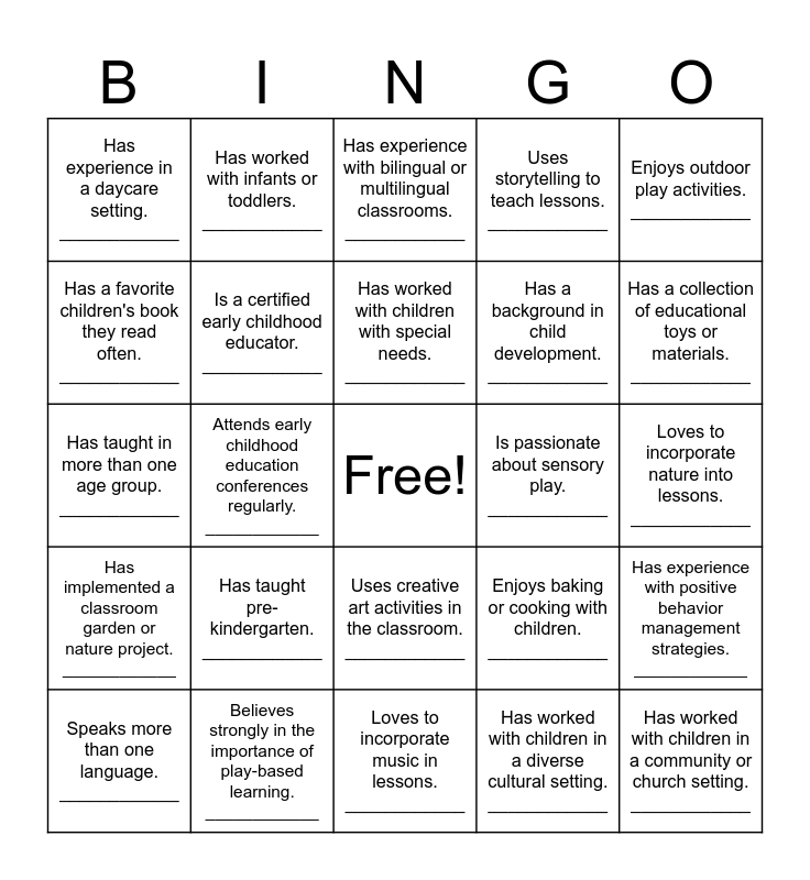 This bingo card has a free space and 25 words: Has taught pre-kindergarten. ____________, Loves to incorporate music in lessons. ____________, Has worked with children with special needs. ____________, Speaks more than one language. ____________, Enjoys outdoor play activities. ____________, Has experience in a daycare setting. ____________, Has a favorite children's book they read often. ____________, Has worked with infants or toddlers. ____________, Is passionate about sensory play. ____________, Uses creative art activities in the classroom. ____________, Has a background in child development. ____________, Has taught in more than one age group. ____________, Enjoys baking or cooking with children. ____________, Has experience with positive behavior management strategies. ____________, Is a certified early childhood educator. ____________, Has organized a field trip for their class. ____________, Loves to incorporate nature into lessons. ____________, Has experience with bilingual or multilingual classrooms. ____________, Has a collection of educational toys or materials. ____________, Attends early childhood education conferences regularly. ____________, Has worked with children in a community or church setting. ____________, Believes strongly in the importance of play-based learning. ____________, Has implemented a classroom garden or nature project. ____________, Uses storytelling to teach lessons. ____________ and Has worked with children in a diverse cultural setting. ____________.