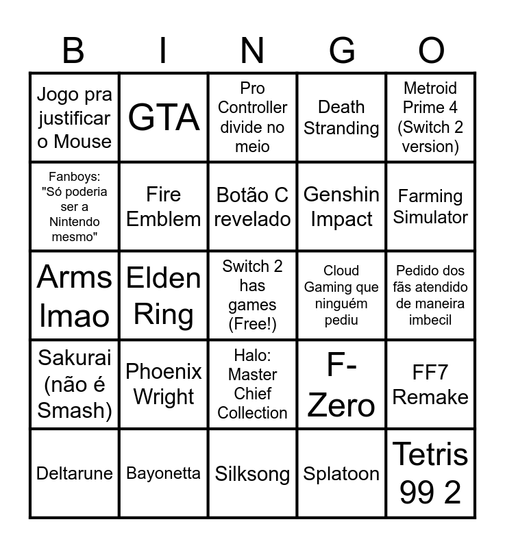 This bingo card has a free space and 64 words: Explicação excessiva, Kirby Spin-off, Wii Virtual Console, FF7 Remake, Third Party exclusivo, 3rd party da Microsoft, GTA, Pokemon gen10, Botão C revelado, Lançamento em Junho, Halo: Master Chief Collection, Miyamoto, Pedido dos fãs atendido de maneira imbecil, Metroid Prime 4 (Switch 2 version), Mother 3, Fanboys: "Só poderia ser a Nintendo mesmo", Elden Ring, Jogo pra justificar o Mouse, Anúncio sem nenhum gameplay, Genshin Impact, Phoenix Wright, Sakurai (não é Smash), Death Stranding, Cyberpunk 77, bravely third/default 3, Smash, mario kart novo, mario party novo, switch sports, algo com mii, hardware gmimmicky caríssimo $$, ToTK, GC Virtual Console, Mario 3d, Farming Simulator, Deltarune, netflix's castlevania the game, Splatoon, Kirby mainline, Fire Emblem, Arms lmao, Cloud Gaming que ninguém pediu, DS Virtual Console, 3DS Virtual Console, Persona/ Metaphor Atlus em Geral, Tetris 99 2, Bayonetta, Star fox, F-Zero, Jogo de personagem secundário de Mario, Party Game de lançamento, Monster Hunter Wilds, Silksong, Mario no Fortnite, Novo 1-2 Switch!, Fifa 25, Pro Controller divide no meio, Conquistas/ Troféus, Nova IP, Zelda velho, HiFi Rush, Patches pra jogos do Switch 1, MINECRAFT! and Trauma Center, foda-se.