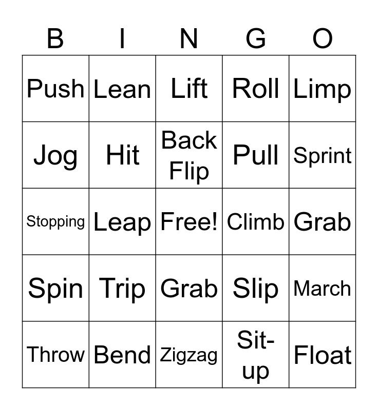 This bingo card has a free space and 26 words: Grab, Sit-up, Back Flip, Bend, Limp, Push, Jog, Lean, Grab, Slip, Pull, Stopping, March, Throw, Leap, Sit-up, Roll, Spin, Lift, Float, Sprint, Zigzag, Climb, Trip, Hit and Look.