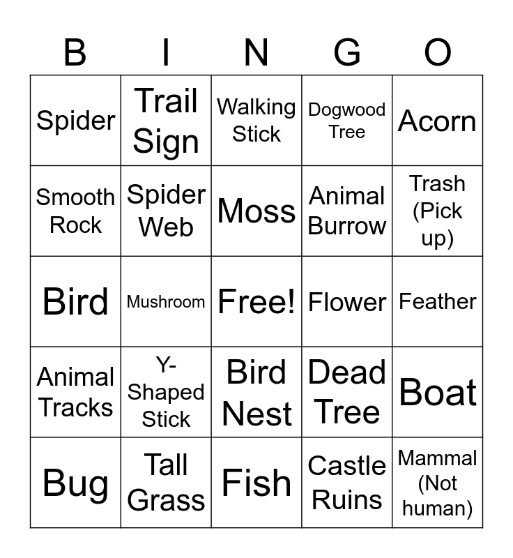 This bingo card has a free space and 24 words: Y-Shaped Stick, Tall Grass, Moss, Bug, Acorn, Spider, Smooth Rock, Trail Sign, Flower, Bird Nest, Animal Burrow, Bird, Dead Tree, Boat, Spider Web, Castle Ruins, Feather, Walking Stick, Trash (Pick up), Mushroom, Mammal (Not human), Animal Tracks, Dogwood Tree and Fish.