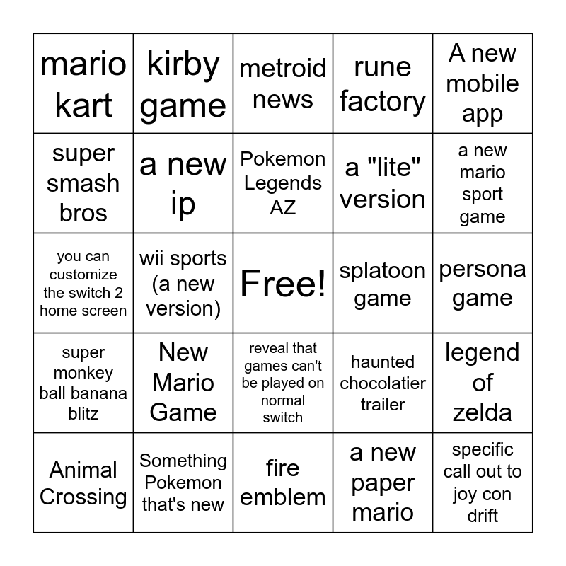 This bingo card has a free space and 24 words: New Mario Game, Something Pokemon that's new, Pokemon Legends AZ, Animal Crossing, A new mobile app, mario kart, super smash bros, kirby game, splatoon game, reveal that games can't be played on normal switch, a "lite" version, you can customize the switch 2 home screen, haunted chocolatier trailer, legend of zelda, a new ip, a new paper mario, persona game, metroid news, a new mario sport game, wii sports (a new version), specific call out to joy con drift, super monkey ball banana blitz, rune factory and fire emblem.