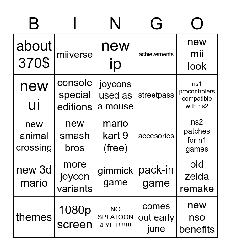 This bingo card has a free space and 24 words: more joycon variants, 1080p screen, joycons used as a mouse, themes, new mii look, about 370$, new ui, miiverse, accesories, gimmick game, streetpass, new animal crossing, pack-in game, old zelda remake, console special editions, comes out early june, ns2 patches for n1 games, new ip, ns1 procontrolers compatible with ns2, new smash bros, new nso benefits, new 3d mario, achievements and NO SPLATOON 4 YET!!!!!!!.