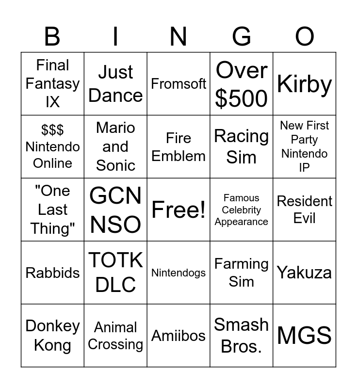 This bingo card has a free space and 24 words: TOTK DLC, Animal Crossing, Fire Emblem, Donkey Kong, Kirby, Final Fantasy IX, $$$ Nintendo Online, Just Dance, Famous Celebrity Appearance, Nintendogs, Racing Sim, "One Last Thing", Farming Sim, Yakuza, Mario and Sonic, Smash Bros., Resident Evil, Fromsoft, New First Party Nintendo IP, GCN NSO, MGS, Rabbids, Over $500 and Amiibos.