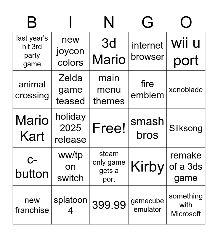 This bingo card has a free space and 24 words: ww/tp on switch, splatoon 4, main menu themes, new franchise, wii u port, last year's hit 3rd party game, animal crossing, new joycon colors, smash bros, steam only game gets a port, fire emblem, Mario Kart, Kirby, remake of a 3ds game, Zelda game teased, gamecube emulator, Silksong, 3d Mario, xenoblade, holiday 2025 release, something with Microsoft, c-button, internet browser and 399.99.
