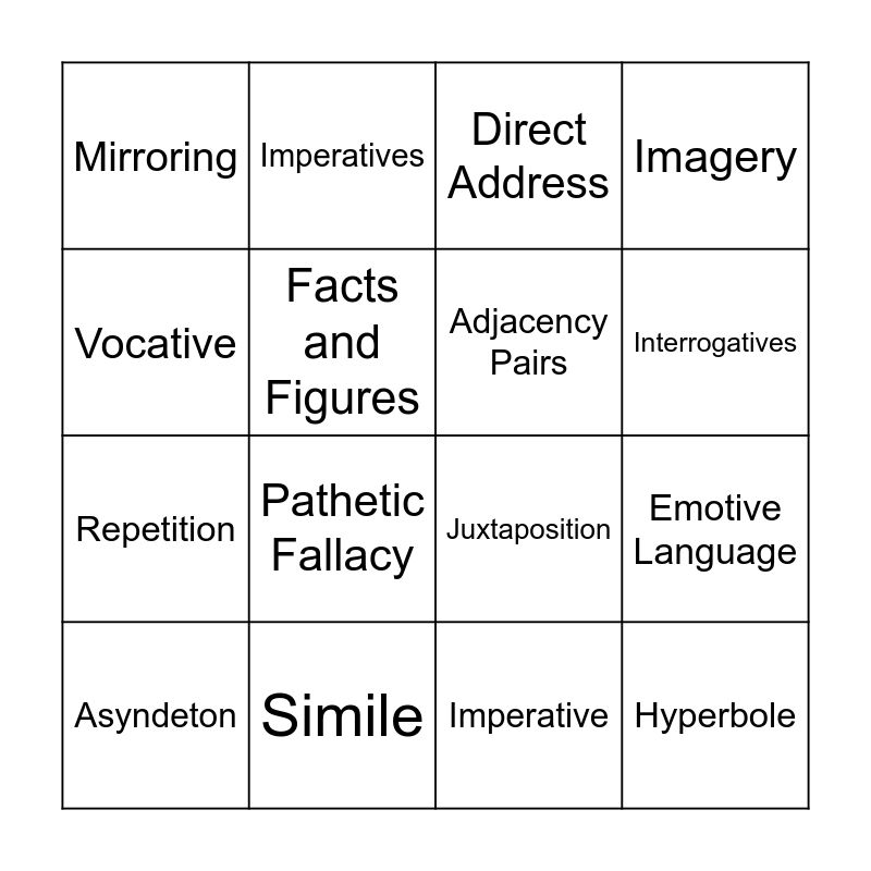 This bingo card has 27 words: Rhetorical Question, Power of 3, Repetition, Alliteration, Facts and Figures, Direct Address, Imperatives, Hyperbole, Simile, Metaphor, Juxtaposition, Imagery, Onomatopoeia, Personification, Pathetic Fallacy, Latching, Adjacency Pairs, Interrogatives, Echoing, Mirroring, Imperative, Exclamatory Language, Emotive Language, Asyndeton, Declarative, Vocative and Oxymoron.