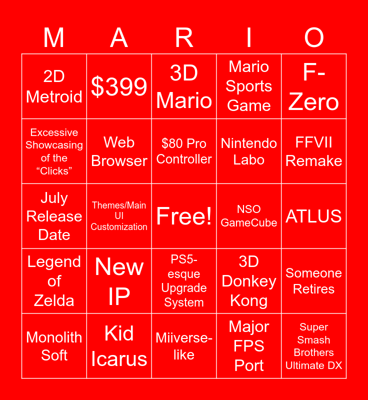 This bingo card has a free space and 25 words: Legend of Zelda, Kid Icarus, Miiverse-like, Major FPS Port, F-Zero, 2D Metroid, $399, 3D Mario, NSO GameCube, Someone Retires, Excessive Showcasing of the “Clicks”, Web Browser, MARIO KART, 3D Donkey Kong, FFVII Remake, Monolith Soft, Themes/Main UI Customization, $80 Pro Controller, Nintendo Labo, ATLUS, July Release Date, New IP, PS5-esque Upgrade System, Mario Sports Game and Super Smash Brothers Ultimate DX.