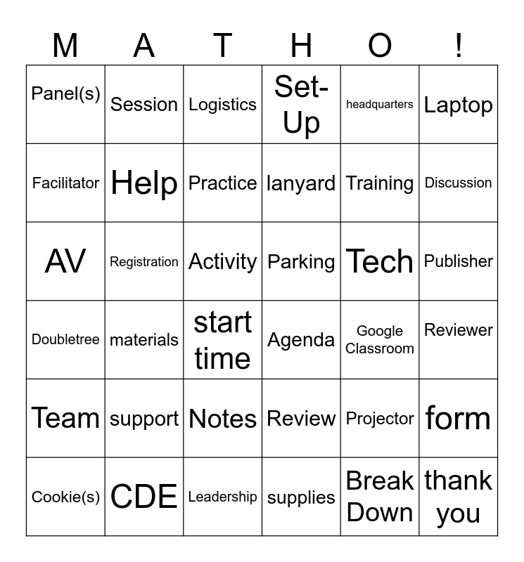 This bingo card has 36 words: Doubletree, materials, Leadership, lanyard, Tech, Publisher, Panel(s), CDE, Logistics, Review, Training, Laptop, Team, Registration, Practice, Set-Up, Projector, Reviewer, Facilitator, Help, start time, Agenda, Google Classroom, form, AV, Session, Activity, supplies, headquarters, Discussion, Cookie(s), support, Notes, Parking, Break Down and thank you.