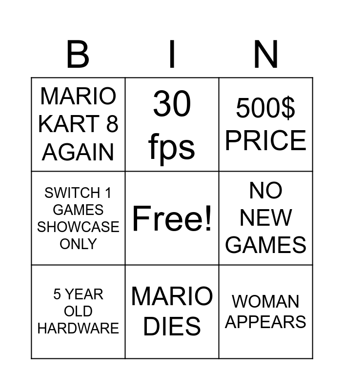 This bingo card has a free space and 8 words: NO NEW GAMES, 500$ PRICE, 30 fps, 5 YEAR OLD HARDWARE, MARIO KART 8 AGAIN, WOMAN APPEARS, SWITCH 1 GAMES SHOWCASE ONLY and MARIO DIES.