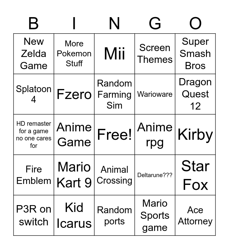 This bingo card has a free space and 24 words: Mario Kart 9, Kid Icarus, Random Farming Sim, P3R on switch, Super Smash Bros, New Zelda Game, Splatoon 4, More Pokemon Stuff, Anime rpg, Animal Crossing, Warioware, HD remaster for a game no one cares for, Deltarune???, Star Fox, Fzero, Mario Sports game, Kirby, Mii, Dragon Quest 12, Anime Game, Ace Attorney, Fire Emblem, Screen Themes and Random ports.