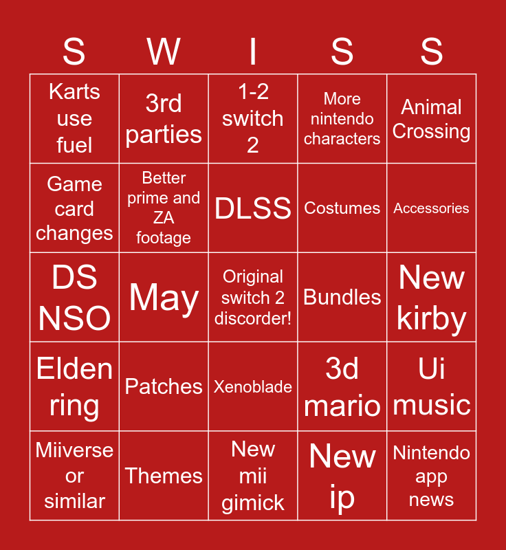 This bingo card has a free space and 69 words: Two color types, New kirby, Its not called mario kart 9, 399$, Themes, Nso features, More nintendo characters, KH4 (Insanity), Animal Crossing, Zelda, Ui music, Kid Icarus, Karts use fuel, 1-2 switch 2, Smash bros, May, Xenoblade, Costumes, Campus, Elden ring, Bundles, 3d mario, Accessories, Top port features, DK, June, C button is cool, F-zero, New ip, Star fox, 3rd parties, Next monolith soft project, VC, Mother 3, Pre orders open, UI is good, Web browser, GC,NSO, Game card changes, Switch one price cuts, Patches, Nintendo app news, switch 2 edition games, Yoshi, Improved eshop, Miiverse or similar, Pikmin, Scarlet/Violet HD, Cat, Better prime and ZA footage, DLSS, 1080p, Switch 1 joycons compat, New mii gimick, Procontroller, Tech demo comes back somehow, HiFi rush, Mouse mode gameplay, Mario maker, DS NSO, silk song (COUGH COUGH COPEEEEEEE), New stick features, Its mario kart 9, Cast button, 350$, 4k native docked, 2nd screen, Mario kart is a launch title and Pro controller touchpad.