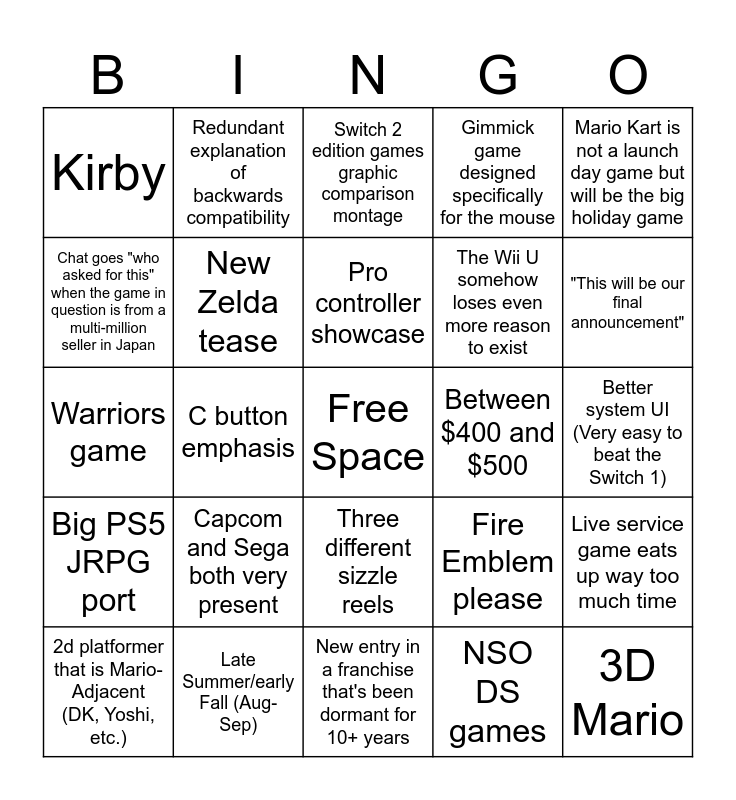 This bingo card has a free space and 24 words: Capcom and Sega both very present, Late Summer/early Fall (Aug-Sep), Pro controller showcase, 2d platformer that is Mario-Adjacent (DK, Yoshi, etc.), Mario Kart is not a launch day game but will be the big holiday game, Kirby, Chat goes "who asked for this" when the game in question is from a multi-million seller in Japan, Redundant explanation of backwards compatibility, Between $400 and $500, Three different sizzle reels, The Wii U somehow loses even more reason to exist, Warriors game, Fire Emblem please, Live service game eats up way too much time, New Zelda tease, NSO DS games, Better system UI (Very easy to beat the Switch 1), Switch 2 edition games graphic comparison montage, "This will be our final announcement", C button emphasis, 3D Mario, Big PS5 JRPG port, Gimmick game designed specifically for the mouse and New entry in a franchise that's been dormant for 10+ years.