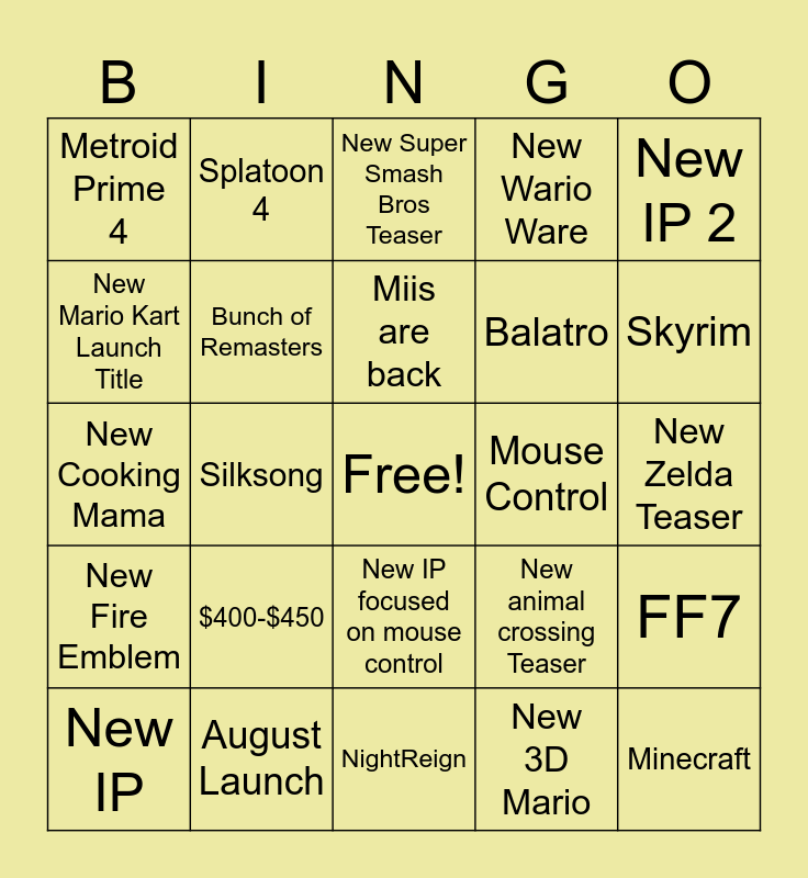 This bingo card has a free space and 24 words: $400-$450, August Launch, Miis are back, New IP, New IP 2, Metroid Prime 4, New Mario Kart Launch Title, Splatoon 4, Mouse Control, New IP focused on mouse control, Balatro, New Cooking Mama, New animal crossing Teaser, FF7, Bunch of Remasters, New 3D Mario, New Zelda Teaser, New Super Smash Bros Teaser, Skyrim, Silksong, Minecraft, New Fire Emblem, New Wario Ware and NightReign.